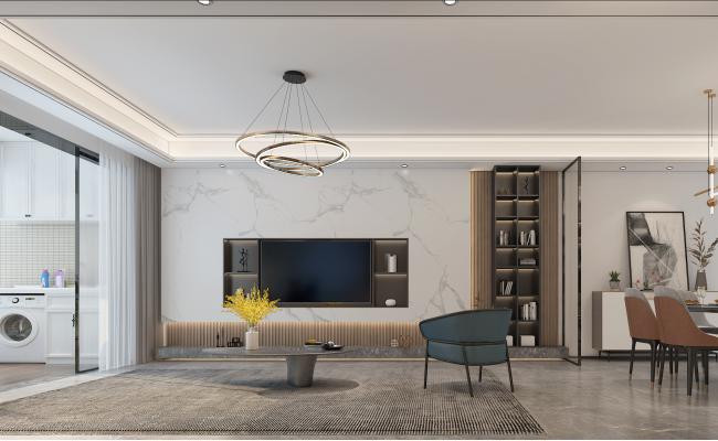 空間以開闊格局勾勒大氣輪廓,大理石的清冽與織物的溫軟細膩交織,在碰撞中蘊生豐富層次;筒燈似有似無地點綴其間,為整體暈染出一層溫潤而雅致的柔光。