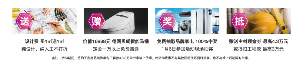 活動期間下定,除了享受不漲價特權,還有豐厚的活動福利。設計五折、材料萬元補貼,簽單即送價值16888元德國進口貝朗智能馬桶、多功能麥石鍋,更有砸金蛋送家電大禮,美的冰箱,海爾洗衣機,掃地機器人,九陽電磁爐等,100%有獎,品質家電有保障,拎包入住更省心!