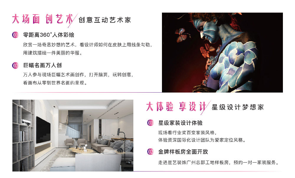 2018年1月6日在廣州白云區五號停機坪購物廣場舉行盛大落地活動,到場客戶可欣賞人體彩繪,參與巨幅名畫創作,好禮與樂趣并行。活動現場不止有豐富互動,到場咨詢客戶還可獲得精美禮品一份。活動現場資深設計師云集,一對一專業咨詢,體驗優質的家裝服務。